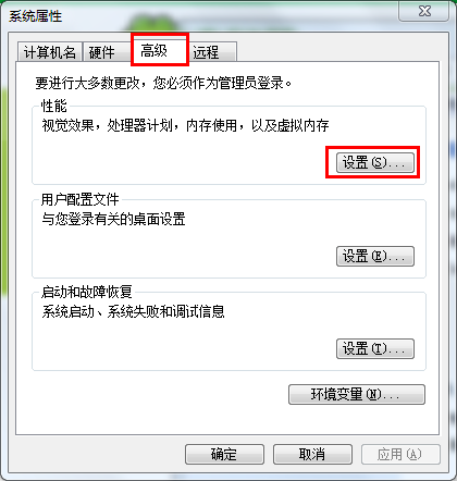 3此时会跳出系统属性界面,将上方的标签切换到“高级”,点击下方性能里的“设置按钮”
