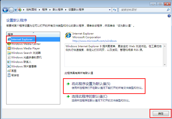 4.在左边栏目中选择要设置的浏览器,然后点击下方第一个选项“将此程序设置为默认值(S)”,点击“确定”按钮保存退出。