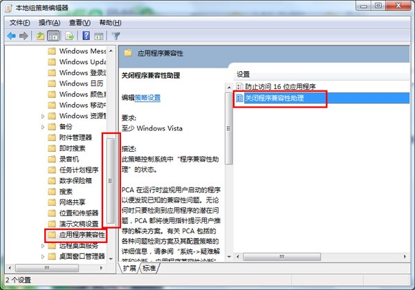 2.打开本地组策略编辑器后,从左边栏目依次进入“用户配置” — “管理模块” — “windows组件” — “应用程序兼容性”(注意下拉滚动条);双击右边栏目中的“关闭程序兼容性助理”,如下图所示。