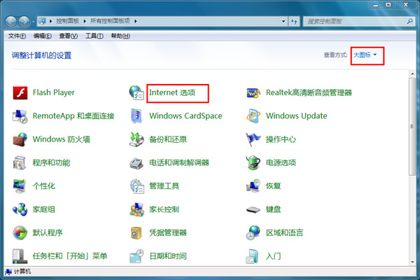 2.在控制面板界面中,将右上角的查看方式切换为“大图标”,点击“Internet选项”,如下图所示