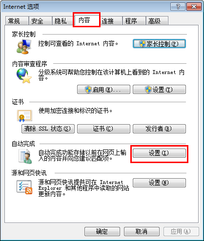 2.切换到“内容”选项卡,点击“自动完成”下的“设置”按钮