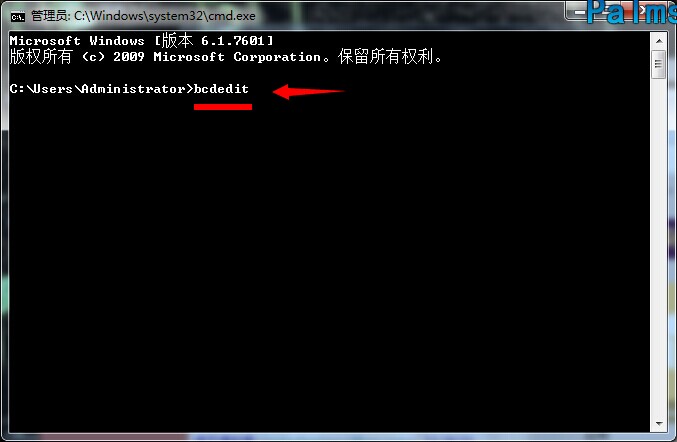 2.在打开的命令提示符窗口中输入“bcdedit”回车。如下图所示
