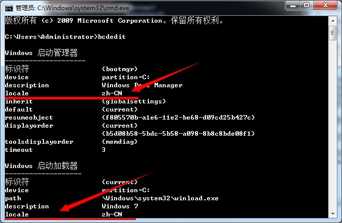 3.检查下Windows启动管理器和Windows启动加载器下locale对应的语言是否与Windows 7系统语言一致,zh-CN代表中文版。如下图所示