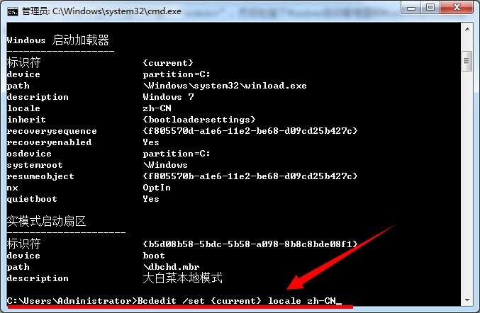 4.如果发现显示不一样的话,就在命令窗口中输入"Bcdedit /set {current} locale zh-CN "回车进行修改,之后重启电脑即可。如下图所示