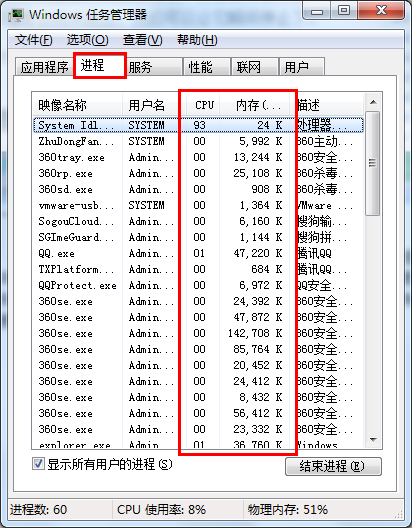 2.切换到“进程”选项卡,可以看到应用程序的cpu跟内存一栏是不断跳动的