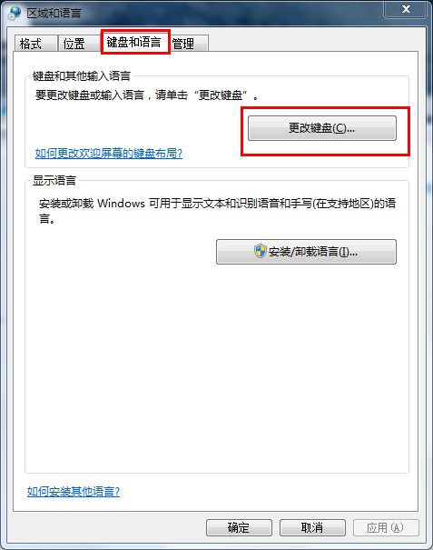 4.在“键盘和语言”选项卡下,点击“更改键盘”按钮,如下图所示