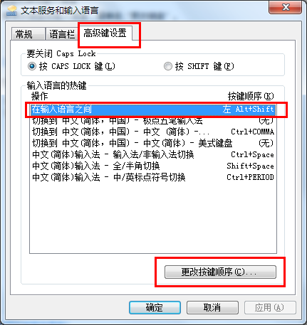 5.此时会弹出如下窗口,切换到“高级键设置”选项卡,点击选中“在输入语言之间”选项,点击“更改按键顺序”按钮,如下图所示。