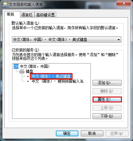 2.在弹出的“文本服务和输入语言窗体里面”,点击“中文(简体)---美式键盘”,右边的属性按钮就可以点击了。点击那个属性按钮。如下图所示
