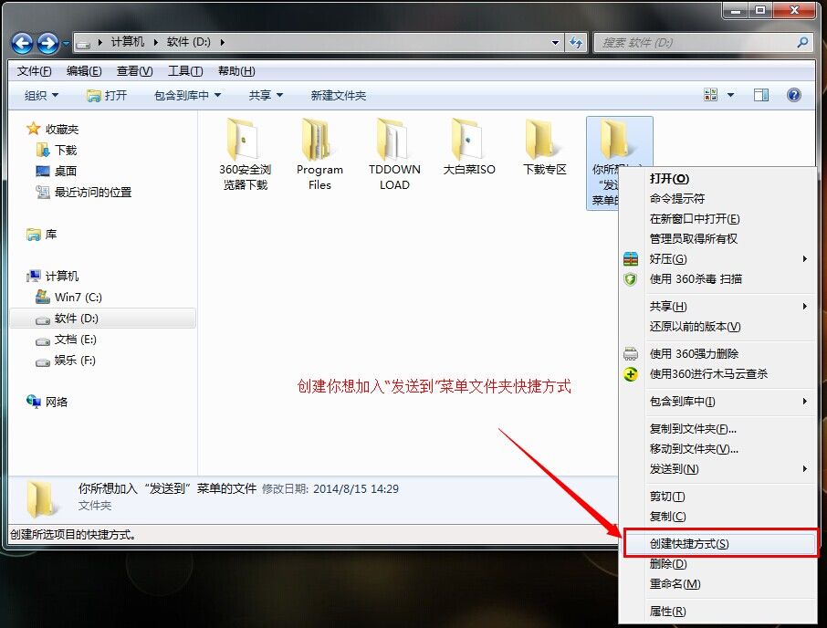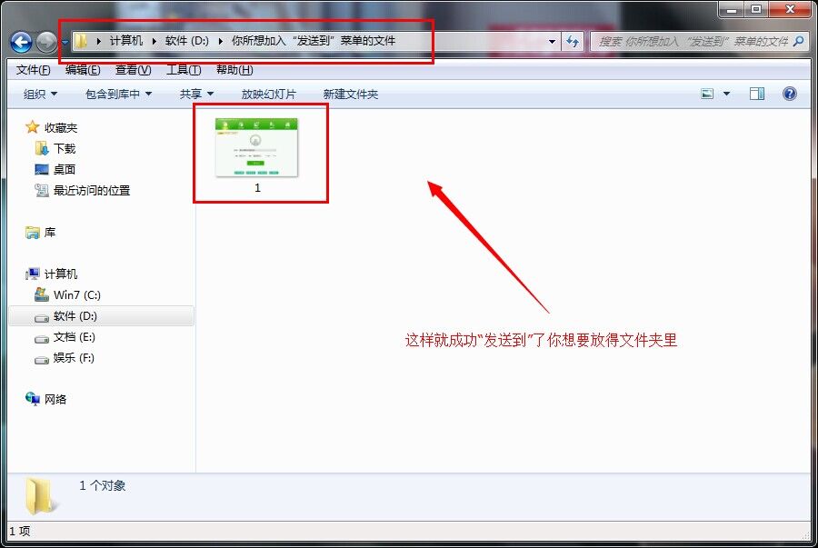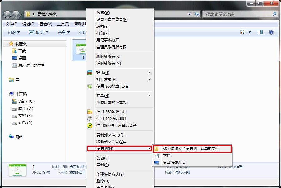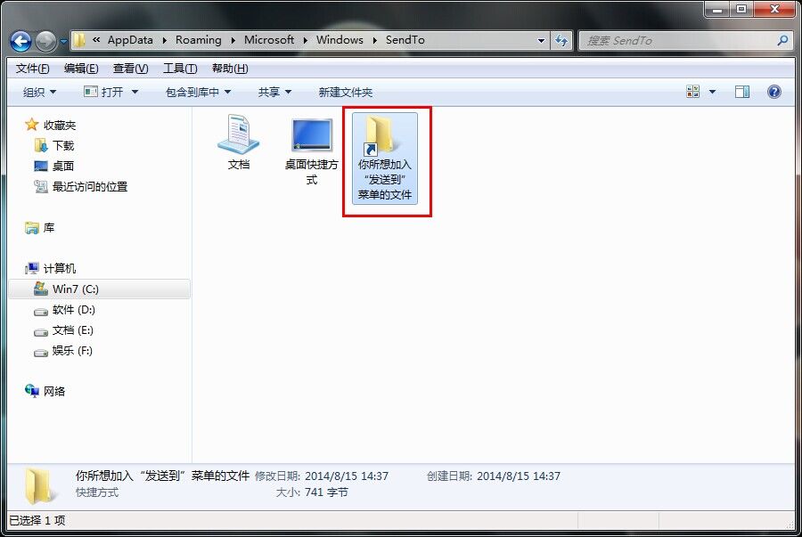 4.右键你所操作的文件,选择“发送到”你所想存放文件的文件夹(这里你会发现已经成功把想存放文件的文件夹的快捷方式添加到“发送到”中)。如下图所示