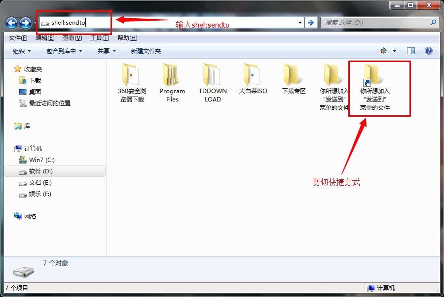 2.在地址栏输入shell:sendto 回车。如下图所示