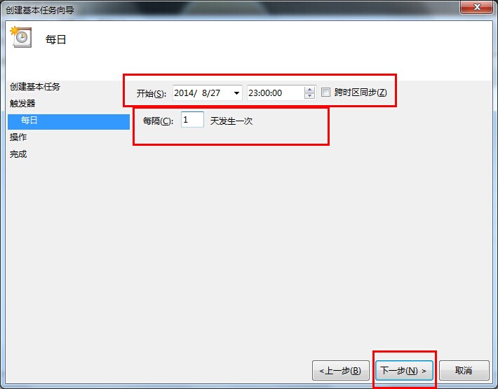5.在创建基本任务向导下“每日”设置,设置好电脑自动关机的具体时间,每隔一天发生一次。如下图所示