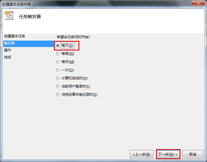 4.到了任务触发器设置界面,我们建议选择“每天”设置,点击下一步进入下一步操作。如下图所示