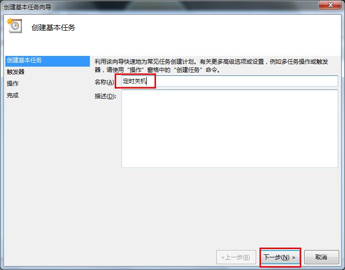 3.进入创建基本任务界面,这边名称建议“定时关机”点击下一步。如下图所示