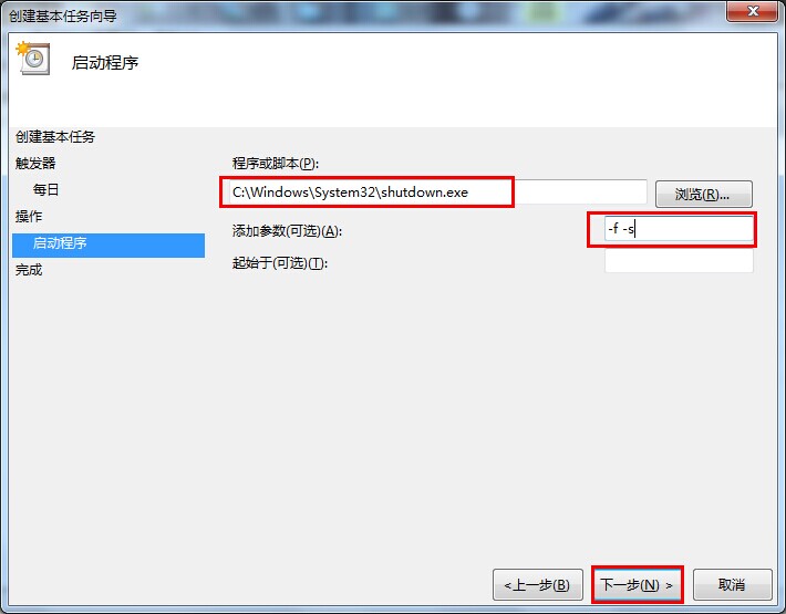 6."启动程序"设置,点击浏览,找到C:Windows\System32\shutdown.exe文件,点击打开,下面的添加参数(可选)(A)我们输入“-f -s”点击下一步完成操作。如下图所示