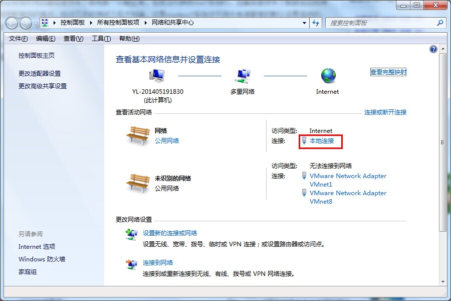 2.在打开的网络和共享中心界面下,我们选择打开“本地连接”如下图所示