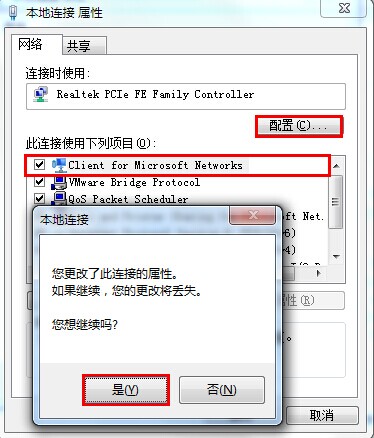 4.这里我们选择“Client for Microsoft Networks”点击右上角的“配置(C)”在弹出的本地连接提示框中点击“是(Y)”如下图所示