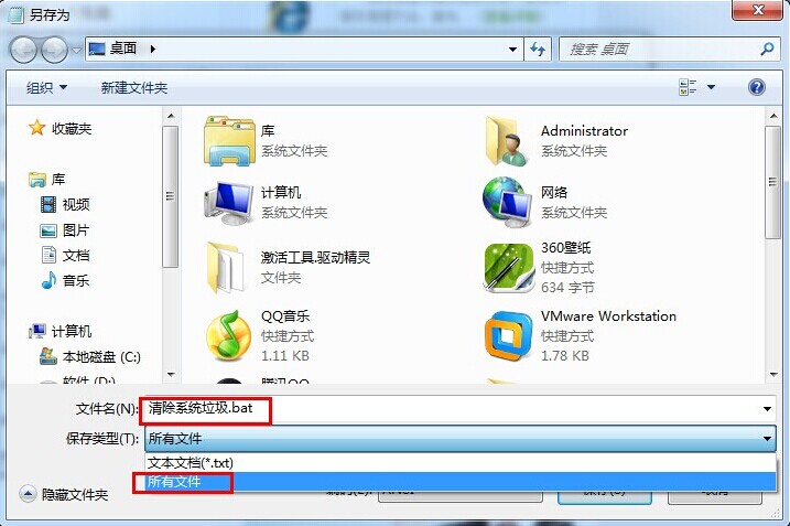 3.点击文件选择“另存为”项,把文件名修改为“清除系统垃圾.bat”,保存类型选择“所有文件”如下图所示