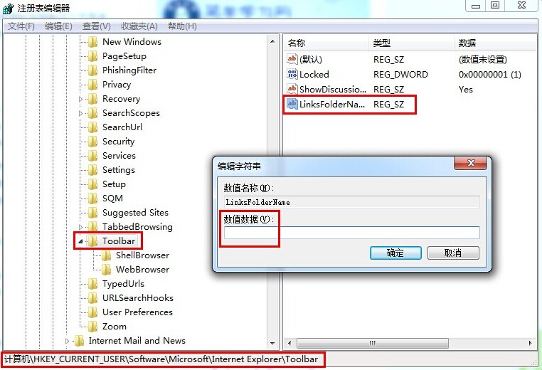 3.在打开的注册表编辑器中,依次展开HKEY_CURRENT_USER\Software\Microsoft\Internet Explorer\Toolbar项,在右侧栏中找到“LinksFolderName”并双击,将“键值”由“链接”改为一个“空格”。如下图所示