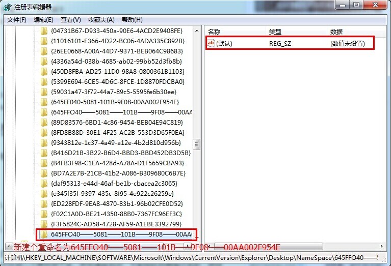 3.在NAMESPACE项下左边空白的地方点击“新建”项,把它命名为“645FFO40——5081——101B——9F08——00AA002F954E”。如下图所示