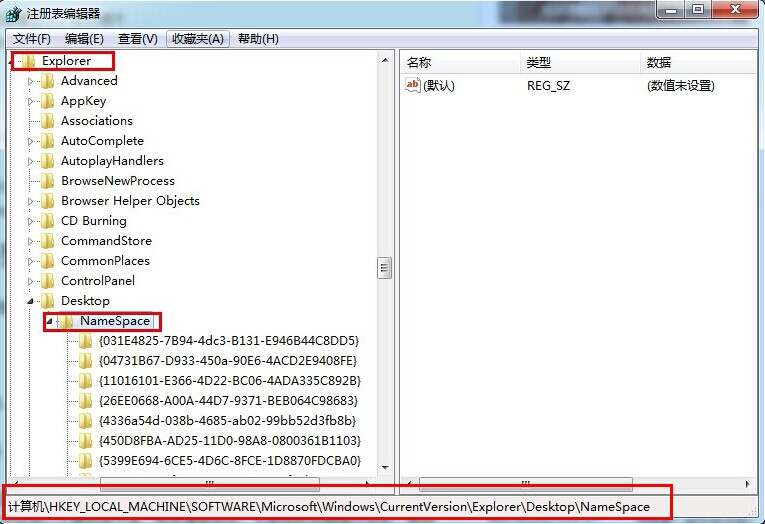 2.在打开的注册表编辑器里,依次展开:HEKEY—LOCAL—MACHIME/SOFTWARE/microsoft/WINDOWS/ CURRENTVERSION/EXPLORER/DESKTOP/NAMESPACE,如下图所示