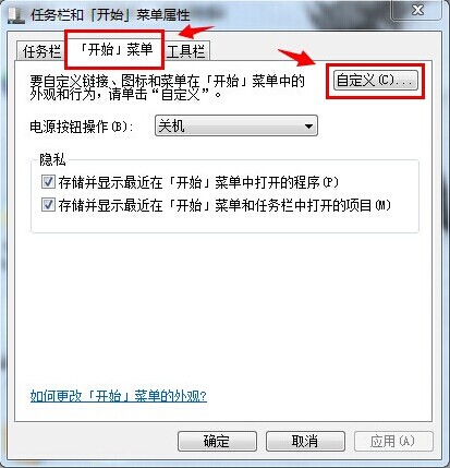 2.在打开的“任务栏和开始菜单属性”界面中,切换到“开始菜单”选项卡,然后点击“自定义”按钮。如下图所示