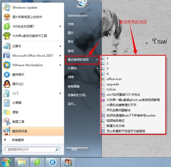 4.回归电脑桌面,打开开始菜单,查看最近使用项目功能是否已经成功添加到开始菜单里。如下图所示