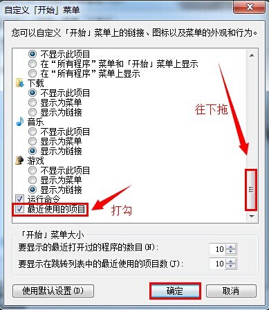 3.在“自定义开始菜单”中,我们把功能界面拉到最底端,然后勾选“最近使用的项目”,点击确定完成操作。如下图所示