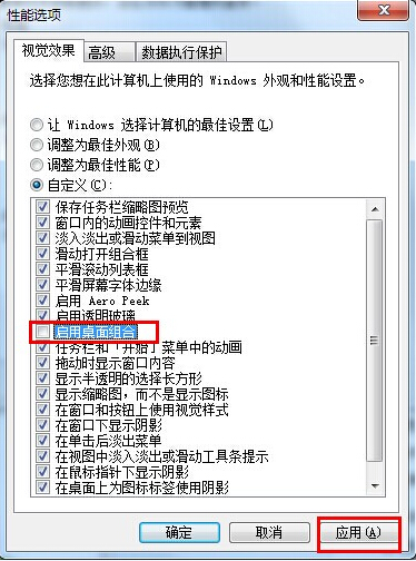 5.在性能选项属性窗口 – 视觉效果下,找到“启用桌面组合”取消勾选,点击确定完成设置。如下图所示
