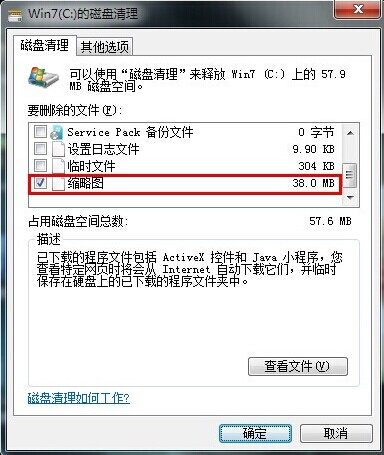 4.在打开的win7:(C)的磁盘清理窗口,勾选缩略图点击“确定”进入下一步操作。如下图所示