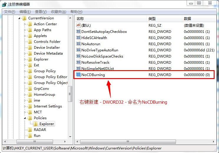 3.在Explorer项右边界面空白处,右键新建 – DWORD32 命名为NoCDBurning。如下图所示
