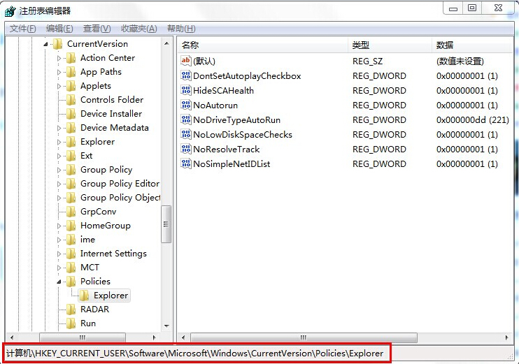 2.在注册表编辑器中,依次展开HKEY_CURRENT_USER\Software\Microsoft\Windows\CurrentVersion\Policies\Explorer键值。如下图所示