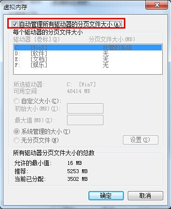 5.在虚拟内存设置界面,取消勾选“自动管理所有驱动器的分页文件大小”如下图所示