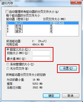 6.点击选择可用空间下的“自定义大小”然后输入“初始大小”和“最大值”,点击设置进行设置。如下图所示