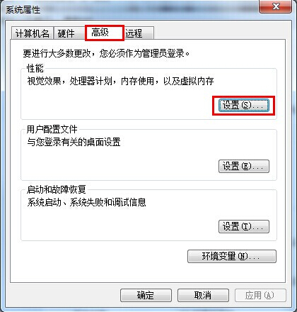 3.在系统属性界面,切换到“高级”选项,点击性能栏下的“设置(S)”按钮。如下图所示