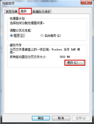 4.打开“性能选项”对话窗口,切换到“高级”选项,点击打开虚拟内存下的“更改”按钮。如下图所示