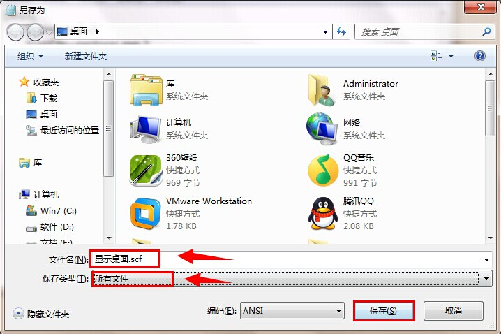 3.选择点击左上角的“文件”菜单――“另存为……”,保存路径选择“桌面”;保存类型选择为“所有文件”;保存文件名为 "显示桌面.scf" 点击确定保存。如下图所示