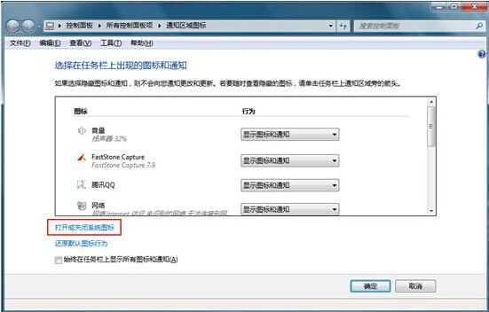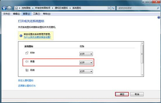 4.在系统图标窗口中,将系统音量图标改为“打开”按确定完成操作。如下图所示