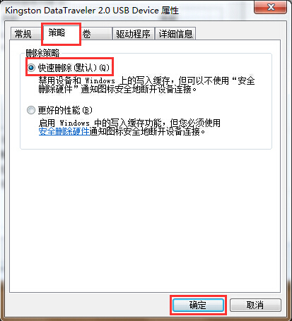 3.在打开的窗口中,切换到“策略”项,点击选择“快速删除(默认)(Q)”点击确定完成设置。如下图所示