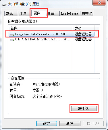 2.在打开的u盘属性界面,切换到“硬件”选项卡,选择u盘,点击“属性(R)”按钮进入下一步操作。如下图所示