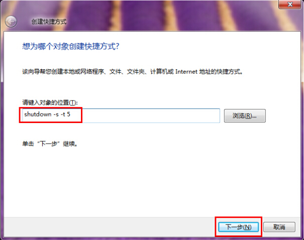 2.在创建快捷方式窗口界面中,我们在对象的位置中输入“shutdown –s –t 5”指令,然后点击“下一步”按钮,如下图所示