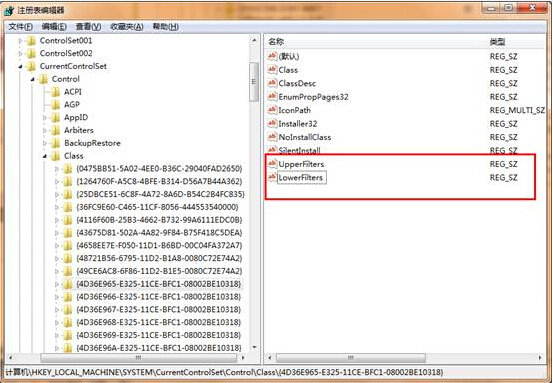 3.在右面的框里找到并删除UpperFilters和LowerFilters。如下图所示