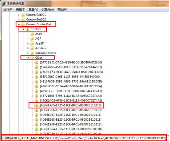 2.在打开的注册编辑器的界面,我们依次打开HKEY_LOCAL_MACHINE--SYSTEM--CurrentControlSet--Control--Class--{4D36E965-E325-11CE-BFC1-08002BE10318}。如下图所示
