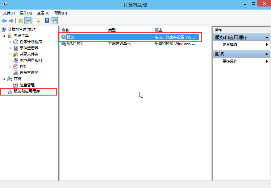 2.在打开的计算机管理窗口中,点击“服务和应用程序”然后再点击打开“服务”进入下一步操作。如下图所示