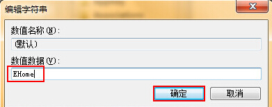 4.打开默认字符串值后,我们将数值数据修改为“EHome”,最后点击“确定”按钮。如下图所示