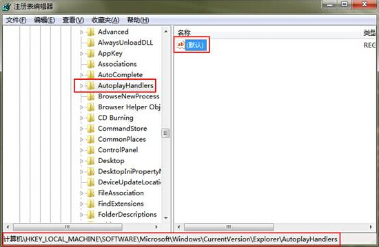 3.在注册表编辑器中,依次打开“HKEY_LOCAL_MACHINE—SOFTWARE—Microsoft—Windows—CurrentVersion—Explorer--AutoplayHandlers”文件夹,在AutoplayHandlers文件夹中,我们可以看到一个默认的字符串值,双击它打开。如下图所示