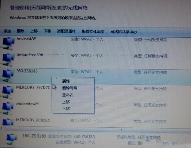 3.在管理无线界面中,右键小红叉对应的SSID名,然后点击“删除网络”进入下一步操作。如下图所示