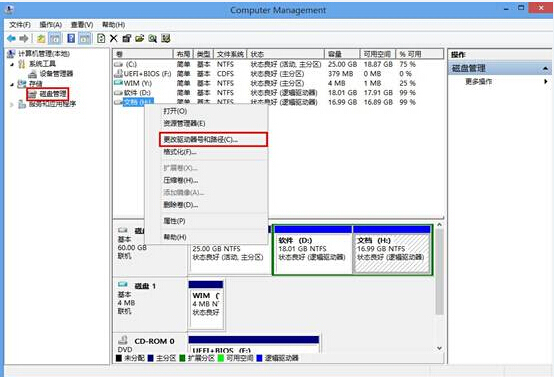 2.在打开的计算机管理界面,点击“磁盘管理”选择想要修改盘符的磁盘右键,点击打开“更改驱动器号和途径(C)…”进入下一步操作。如下图所示
