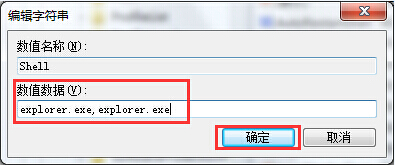 4.在打开的编辑字符串窗口中,修改数值数据位“explorer.exe,explorer.exe”点击确定完成操作。如下图所示