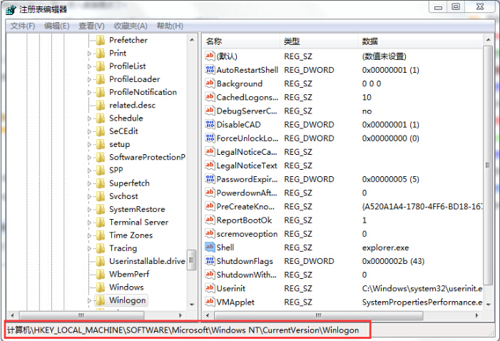 2.在打开的注册表编辑器中依次展开HKEY_LOCAL_MACHINE/SOFTWARE/Microsoft/Windows NT/CurrentVersion/Winlogon进入下一步操作。如下图所示