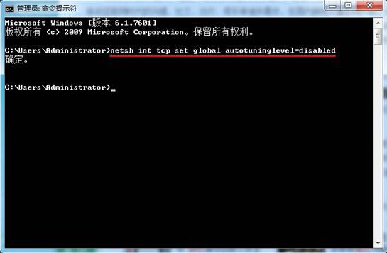 2.在打开的命令窗口中,输入netsh int tcp set global autotuninglevel=disabled回车确认。如下图所示
